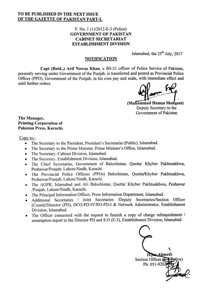 In a notification issued by the Cabinet Secretariat, Khan was “transferred and posted as Provincial Police Officer (PPO), Government of the Punjab, in his own pay and scale, with immediate effect”,