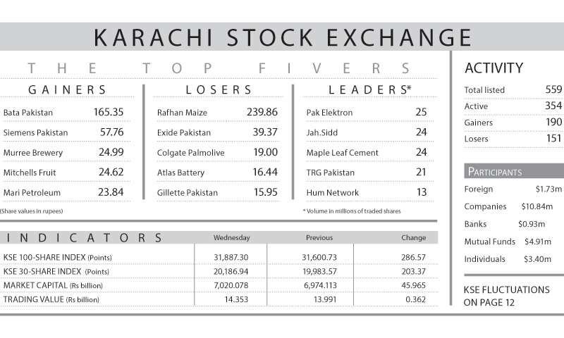 Karachi: Bulls again dominated the stock market on Wednesday as the KSE-100 index gained 286.57 points (0.91per cent) to settle at 31,887.30.