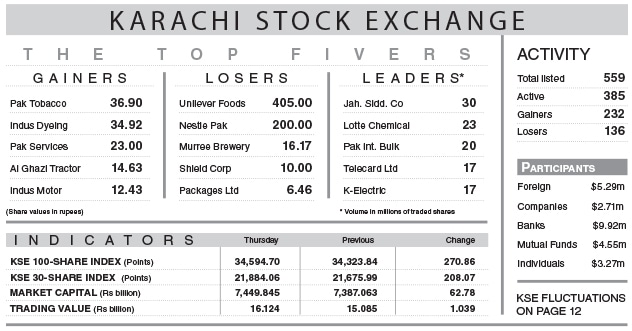 Karachi: Stocks continued to rally on Thursday which saw the bulls toss the KSE-100 index over the 34,500 level for the first time in four months.