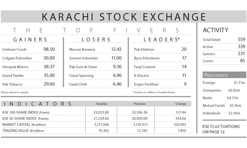 Karachi: Stocks staged partial recovery on Tuesday as the KSE-100 index recouped 517.44 points (1.59 per cent) to close at 33,023.80.