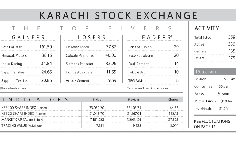 Karachi: The stock market remained range bound on Friday with the KSE-100 index closing down by 64.53 points or 0.19pc at 33,039.20.