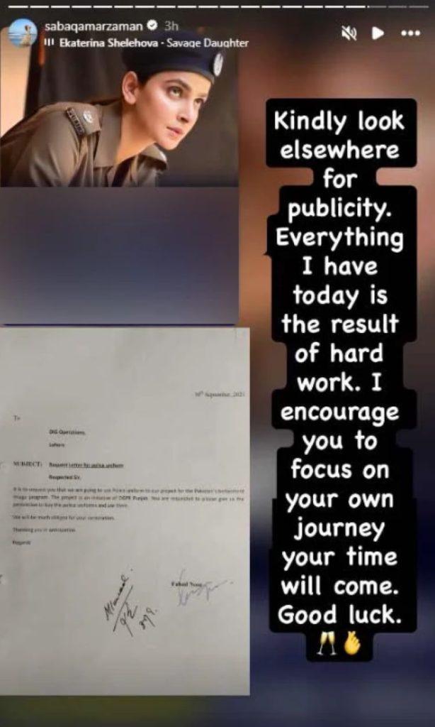 Pakistani actress Saba Qamar has publicly responded to the police uniform controversy after a petition was filed in Lahore seeking to file a criminal case against her.