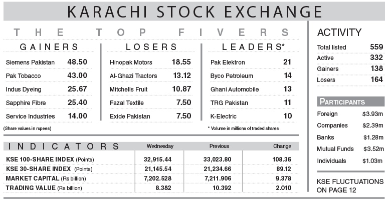 Karachi: After a strong start on Wednesday, the stocks relapsed and the KSE-100 index closed with a loss of 108.36 points (0.33 per cent) at 32,915.44.