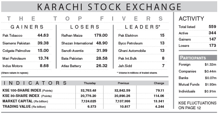 Karachi: The earlier day’s rally proved short-lived as the investors scrambled to seek an exit from the market, pulling the KSE-100 index down by 79.11 points (0.24 per cent) to settle at 32,763.48 on Thursday.