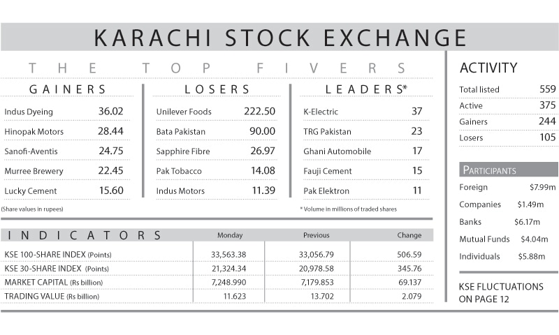 Karachi: Stocks staged surprise rally on Monday with the KSE-100 index gaining 506.59 points (1.53 per cent) to close at three-week high at 33,563.38.