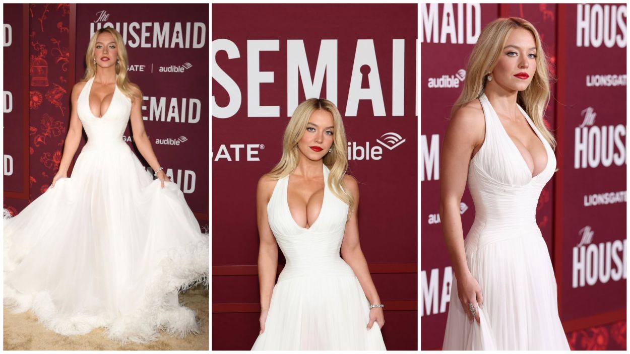 At the Housemaid red carpet premiere, Sweeney arrived in a striking white gown. This immediately set the tone. The design featured a corseted midsection that created an ultra-defined waist, highlighting her hourglass silhouette. A deep, plunging neckline added drama. The voluminous skirt flowed with movement, and soft white feathers finished the hem, adding a sense of grandeur to the look.